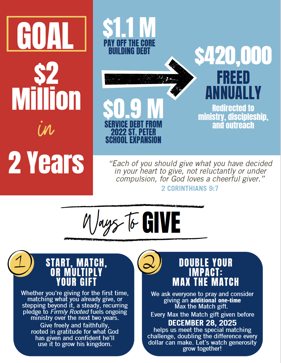 TWO donors have generously offered to gift $208,000 for a matching opportunity to pay off debt. Each dollar from the congregation will be matched up to $208,000. This will allow us to begin paying down our debt as we begin our Firmly Rooted Capital Campaign. This opportunity will run through December 28, 2025 and is an additional one-time gift.